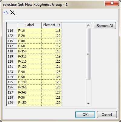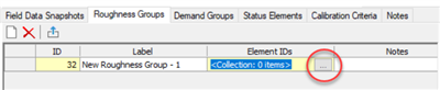 Go to the Roughness Groups tab. Click the New icon to create a new item. It is up to the engineer how many groups to create. The recommended workflow is to group elements that have similar characteristics such as age or material, since it can be assumed that two pipes of the same age or material will see similar changes to the actual roughness (as again, all elements within the groups are adjusted together, not individually). To add elements to the roughness group, click the cell in the Element IDs column and select the ellipsis button.