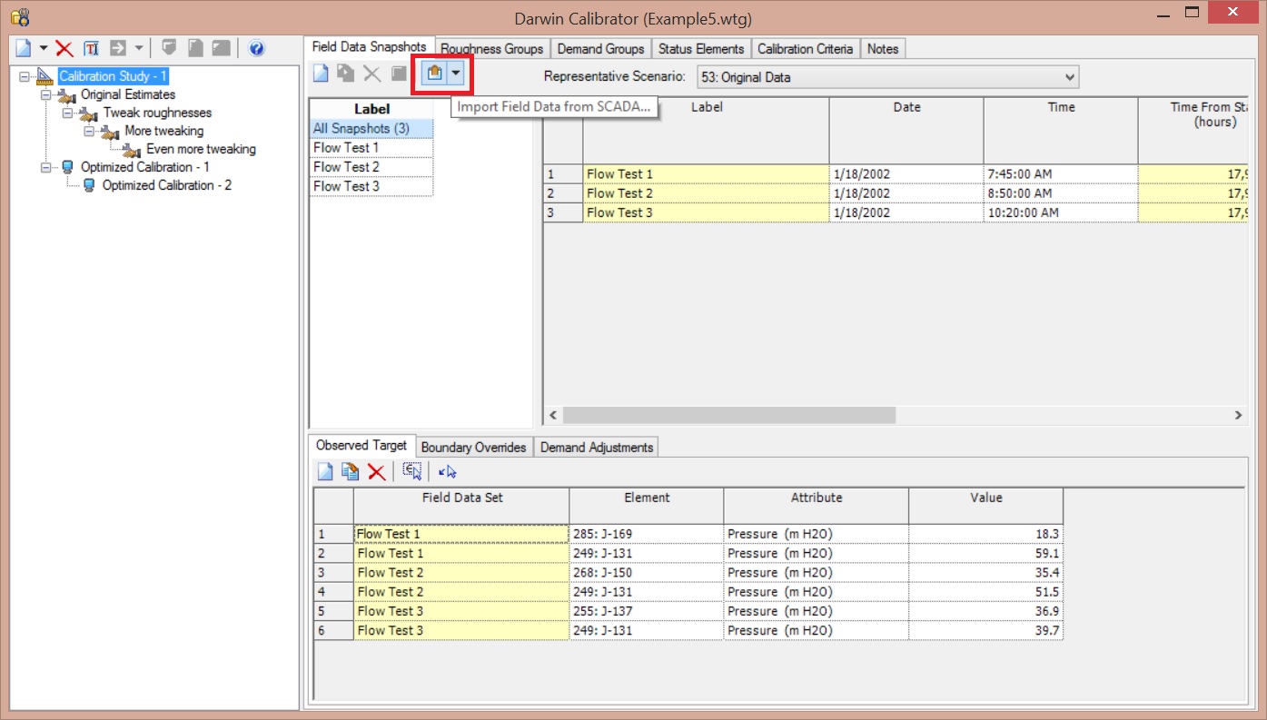 You can also import the field data using Modelbuilder or SCADA, if you have data for multiple elements at multiple times. Steps are importing field data are explained in the help documentation and in this article: Importing Darwin Calibrator Field Data using ModelBuilder