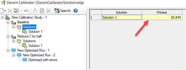 When completed a solution will appear that will include the results from the calibration study. Click “Solutions” directly under the manual run. This will display a fitness value for the solution or solutions. Fitness is a correlation between the observed data from the field data snapshot and the calculated value from the calibration study. The smaller the value, the better the fit.