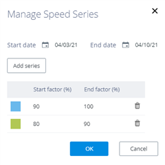 If the pump is a Variable Speed Pump, and the graph option is set to view speed series, the series options have a single date range for all series, and allow multiple series with different speed ranges.