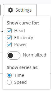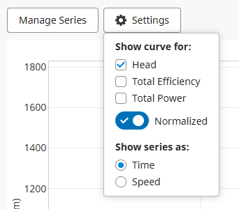 To check the real operating points for each pump speed, the user should disable the normalized option and select the option "Speed" under "Show series as". Example below shows the different actual operating points for the different relative speeds.