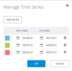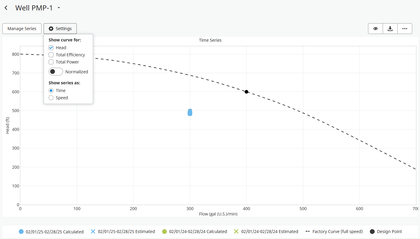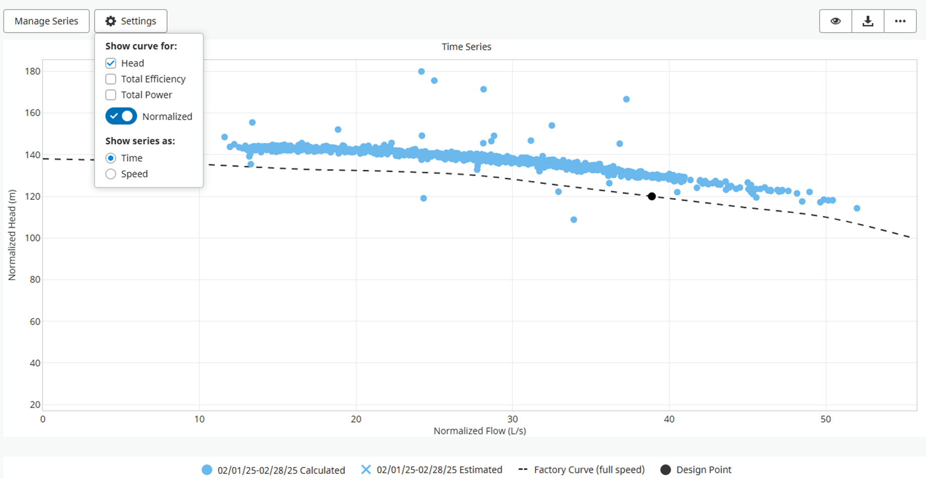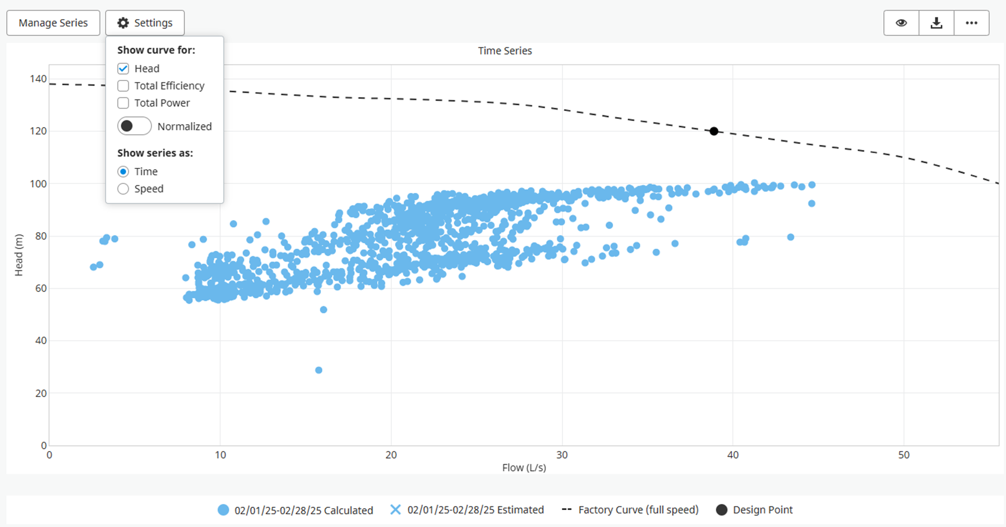 By default, a single series showing operating points from the previous 7 days is displayed. The Manage Series option allows the date range to be edited, as well as adding additional series with different time periods for comparison. This is particularly useful to evaluate whether a pump is degrading over time. The trash icon will remove the series.