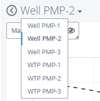 The back arrow navigates to the previous page. Clicking on the down arrow expands a list of all pumps. Select any pump to view the associated graphs.