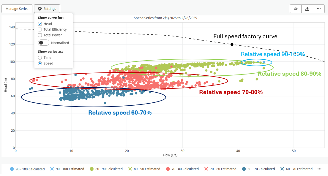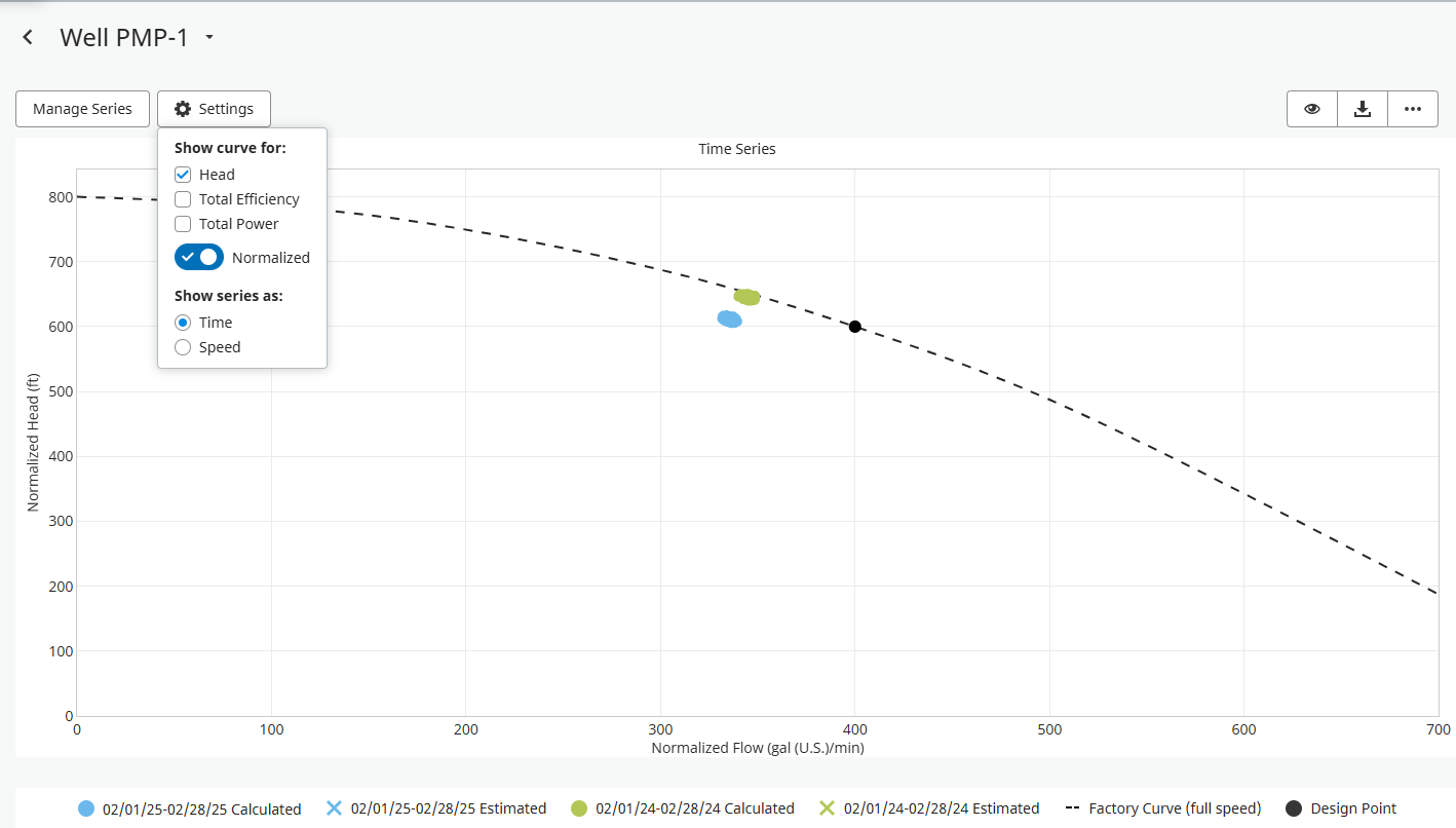 In order to evaluate whether the pump is in good condition, the actual operating points can be normalized using the Pump Affinity Laws to show what the flow and head would be if the pump was operating at full speed. This requires a Speed signal and the full speed value to be configured in the Pump Configuration page. Use the Normalized option to toggle between normalized and normal display. This option is only available for Variable Speed Pumps (note: if this option is not displayed make sure that in the administration the pump is set to variable speed pump).