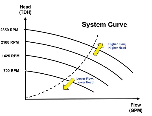 For variable speed pumps the effective head curve that the pump operates on is variable and depending on the pump speed, as shown below.