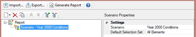To begin, click the New button in the upper left and choose Scenario. This will add an item to the list on the left. You will then need to select a scenario that the report will be generated from. You will also need to choose a Selection Set. NOTE: Choosing a selection set is required. If you don't have a selection set, you can create one by highlighting all elements in the model, then right-clicking anywhere in the drawing, and choosing Create Selection Set.