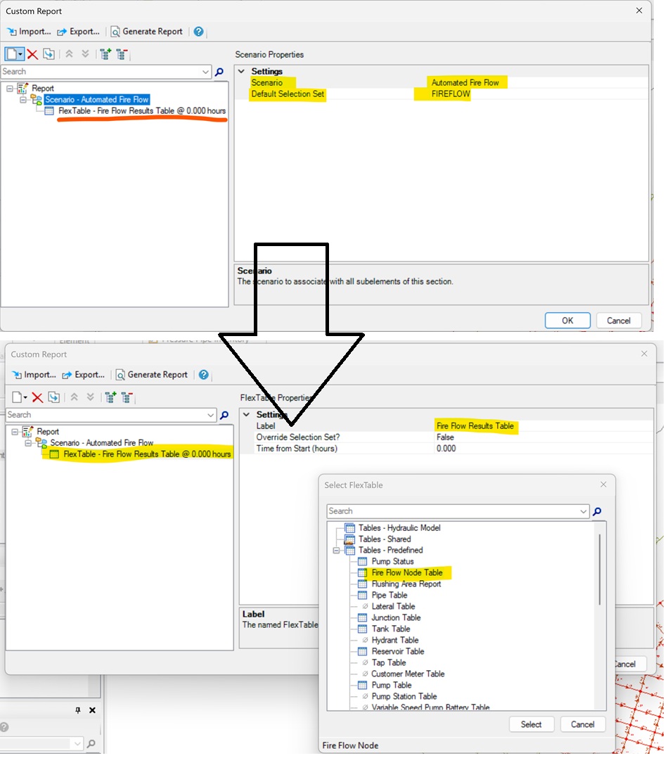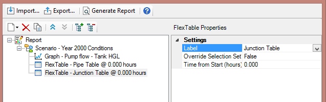 To add FlexTables to the Custom Report, right-click on the scenario on the left of the dialog and choose Add > FlexTables. On the right side of the dialog, choose the FlexTable you want to use by select the Label selection. By choosing Select FlexTable, the FlexTable manager will open and allow you to choose the FlexTable you want to use. Once you do this, you can also select the time step that you want to use for the Custom Report.