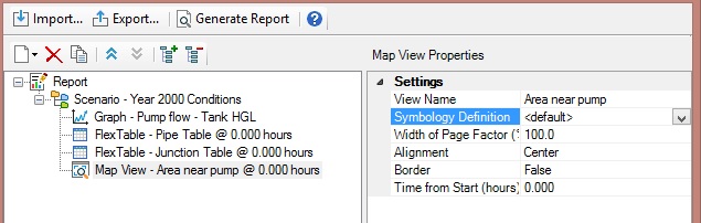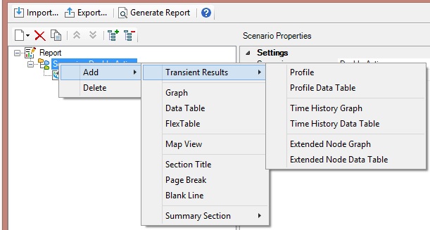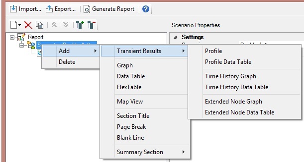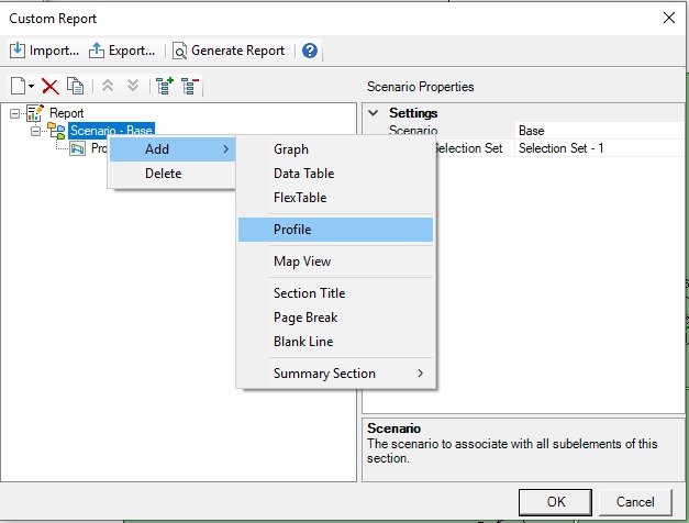 Once the scenario and selection set is created, you can then set up the report how you like. Items that you can add include graphs and data tables, flextables, and views. You can also add page breaks and line breaks, and insert reports that are already available, such as the Scenario Summary Report. To see the available items, right-click on Scenario on the left of the Custom Report dialog. The sections below will briefly touch on some of these features.