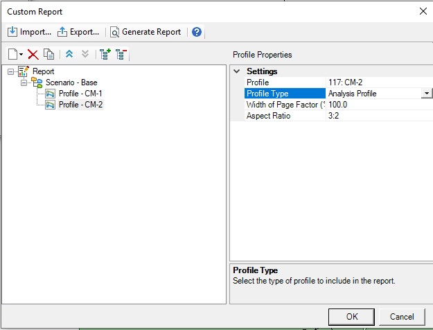 Starting with the CONNECT Edition Update 3 release of the storm-sewer products (build 10.03.01.08), you can now add profiles to custom reports. To add a profile, either right-click on the scenario from the tree-form or click the New Sections button, then choose Profile. You will choose an existing profile and the profile type (Analysis Profile or Engineering Profile). The profile will then be included in the custom report.