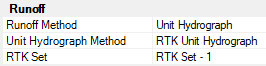 3) Open the properties of your catchments, set the "Runoff Method" to "Unit Hydrograph", select "RTK Unit Hydrograph" from the "Unit Hydrograph" dropdown, then select your RTK set. Global edit in the catchment flextable if you need to change multiple catchments. Use a new Hydrology alternative if you want to keep this configuration separate from other scenarios.