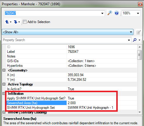 3) Open the properties of your manholes by double clicking on them and set the property for "Apply SWMM RTK Unit Hydrograph Set?" to "True".
