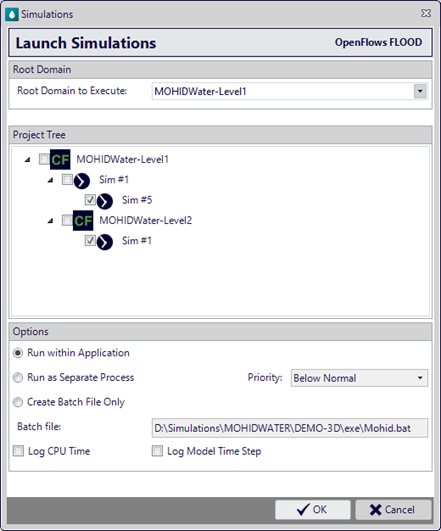 Select the root domain to execute and in the project tree, select parent and child simulations check boxes. Finally press OK to start the simulation.
