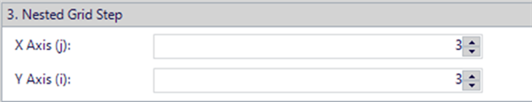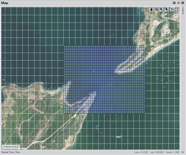 Then click and hold the mouse button over the map and draw a rectangle of the area where you want to refine the horizontal resolution of the parent grid. Release the mouse button to set the rectangle final area and a refined grid will appear in the map, as shown below. You can adjust the final location of the grid by changing the X and Y axis minimum and maximum grid indexes as shown in the image above.