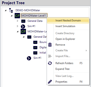 After setting up, and calibrating and validating the parent domain, in OpenFlows FLOOD’s Explorer window select in the parent domain in the tree view. Right click and select “Insert Nested Domain”.