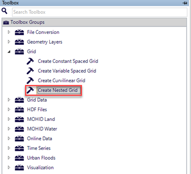 The first step to nest a sub-domain is to create a nested grid. OpenFlows FLOOD has a specific tool to create a nested grid which refines the horizontal resolution of a parent grid In the Map Window, and loads the parent domain Grid layer (which was used to create the parent domain Grid Data bathymetry file). Then go to Tools -> Grid -> Create Nested Grid.