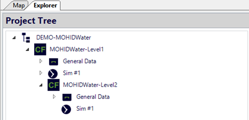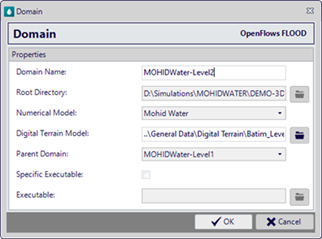 You can notice that the “Numerical Model” and the “Root Directory” are automatically handled by FLOOD and cannot be edited. Also, the “Parent Domain” field is now populated with the name of the corresponding parent domain. Press OK and a new nested domain is created in the domains/simulations tree view as shown below (parent Level 1 and child Level 2) and then select the nested domain, right-click and insert a new simulation.