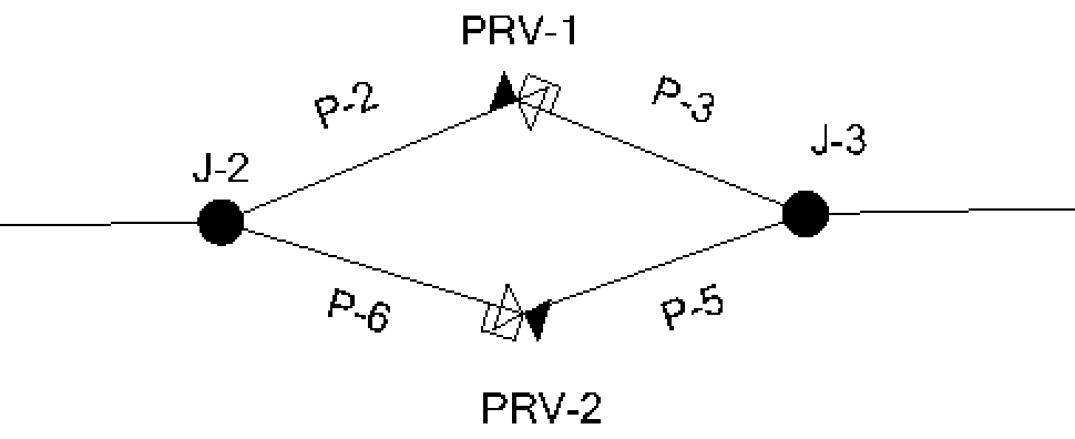 To model a two way PRV where pressure is reduced in either direction, consider modeling two PRVs in parallel with the opposite orientation, like the following screenshot. The "Downstream pipe" properties of the PRV can be used to change the orientation. Depending on the flow direction, only one PRV will throttle at a time, because the other one will automatically close to prevent reverse flow.