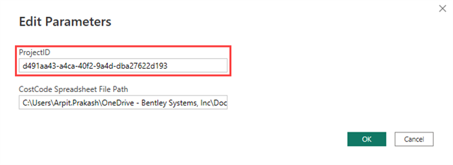 - To open the Bentley Infrastructure Cloud project with the template, go to Home ribbon > Transform Data dropdown > Edit parameter > ProjectID - Enter Bentley Infrastructure Cloud project ID -