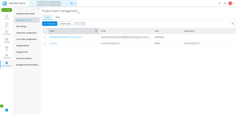 Select the SYNCHRO 4D project > Administration > Manage your team > Add users > Add user provided from Service app