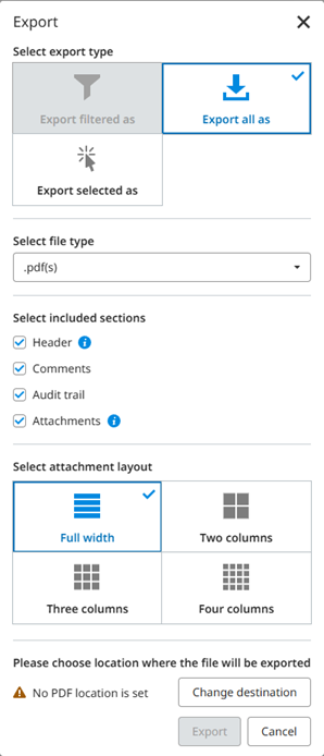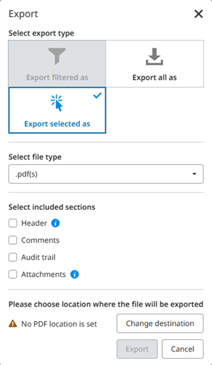 - Click the Change destination button to display the following dialog to select an export location. The export is sent to the defined location in the Documents section: