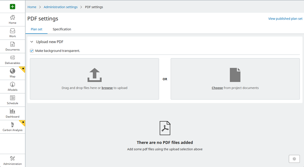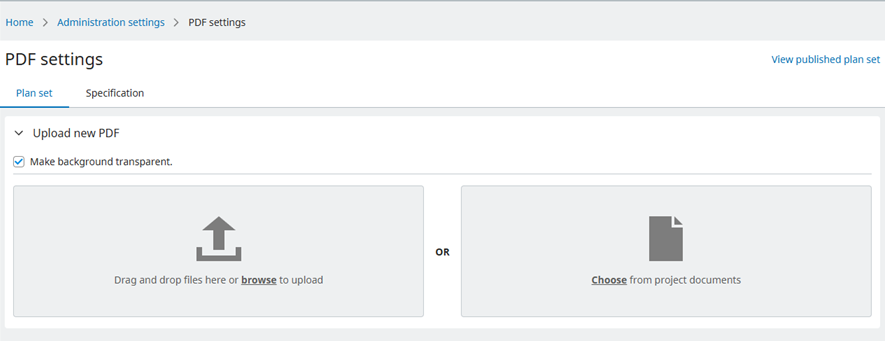 Before uploading the files there is an option to Make background transparent. When checked, the white of the PDF will be transparent and when unchecked, a traditional white paper background will be displayed. This option is presented when the PDF is added as a layer on the map in SYNCHRO Control.