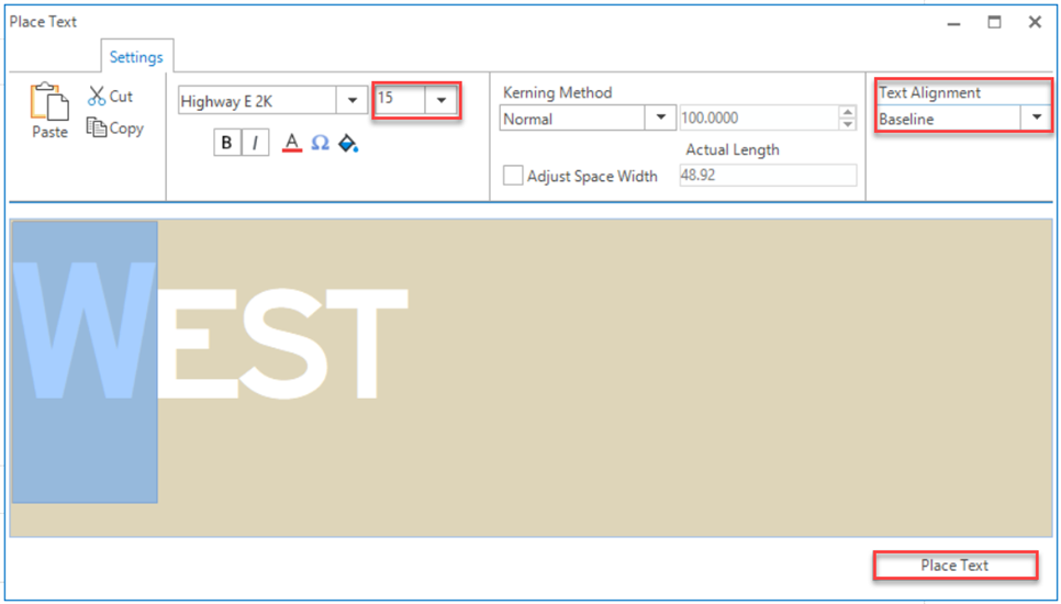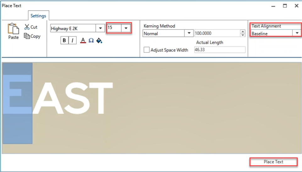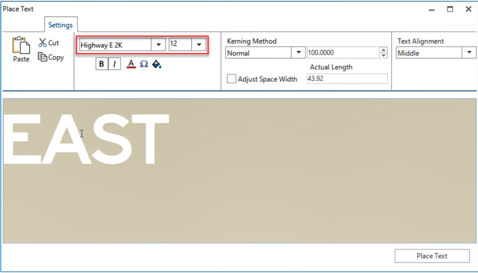 Step 5: Click on Text>Place Text. In the Place Text dialog, select Font: Highway E 2K, Size: 12 and default Color: White. Press the <CapsLock> button, click in the Place Text dialog and type EAST.