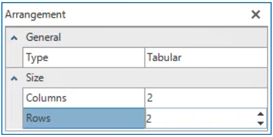 Step 2: In the Arrangement dialog, select Type: Tabular and set Columns: 2 and Rows: 2. Left-click on the workspace to place the tabular arrangement.