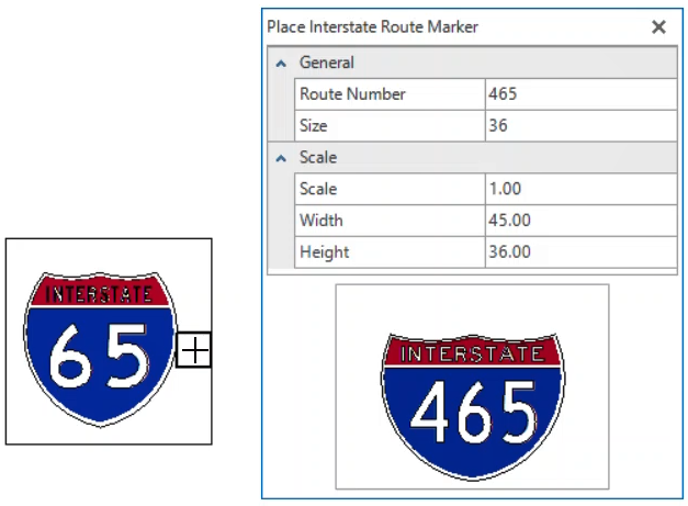 Step 3: Click on Route Markers>Interstate>Interstate. In the Place Interstate Route Marker dialog, enter Route Number 65 and select Size 36 from the drop-down menu. Hover the cursor over the tabular arrangement and left-click to place the I-65 shield in column 1, row 2. Close the Place Interstate Route Marker dialog.