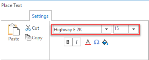 Step 1: Click on Text>Place Text. In the Place Text dialog, select Font: Highway E 2K and Size: 15.