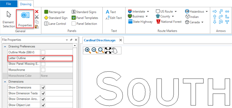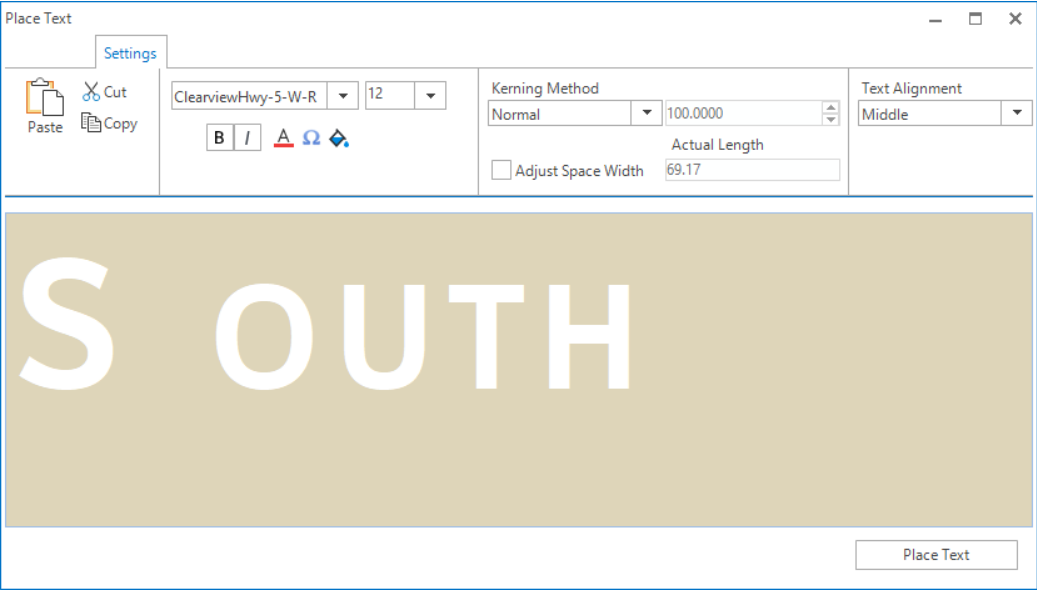 Step 2: Click in the Place Text dialog and type S. Change the Size: 12 and type <space>OUTH. The Clearview font has no definition for the spacing between letters of different sizes, therefore, a space character is added to set the value. Select the space character between S and OUTH and set the Size: 3 by entering 3 in the Size field and pressing <enter>.