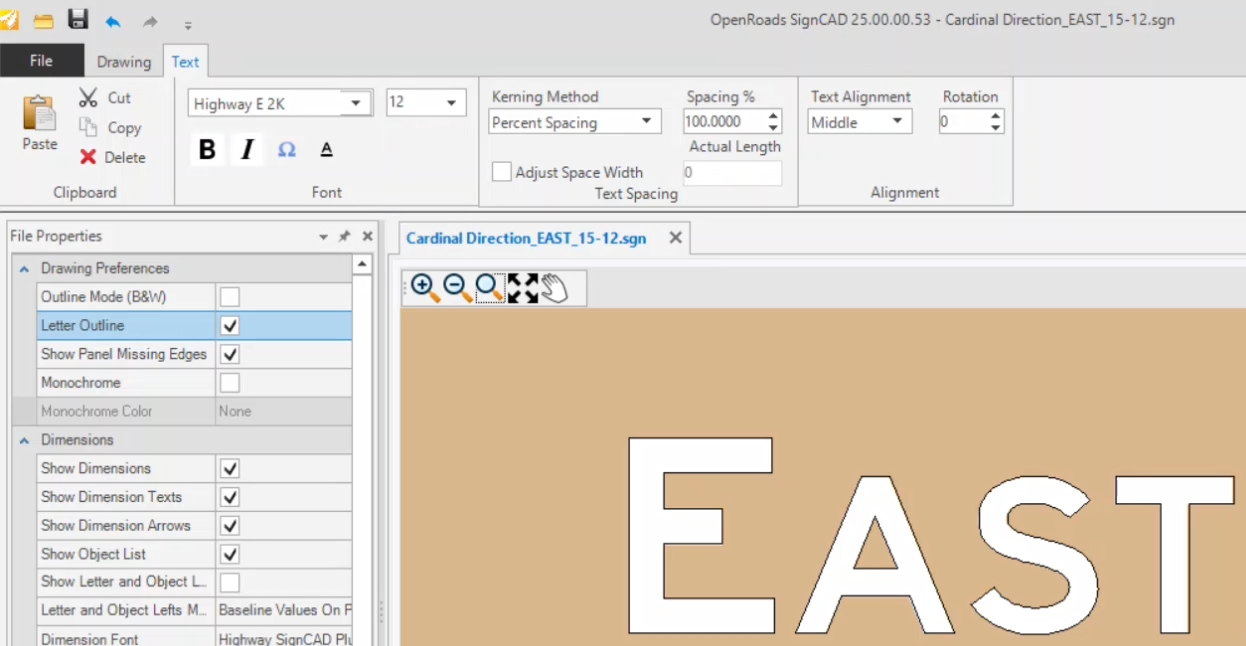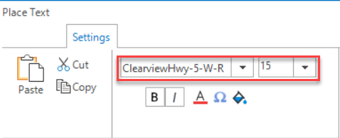 Step 1: In OpenRoads SignCAD, pick Text>Place Text. In the Place Text dialog, select Font: ClearviewHwy-5-W-R and Size: 15.
