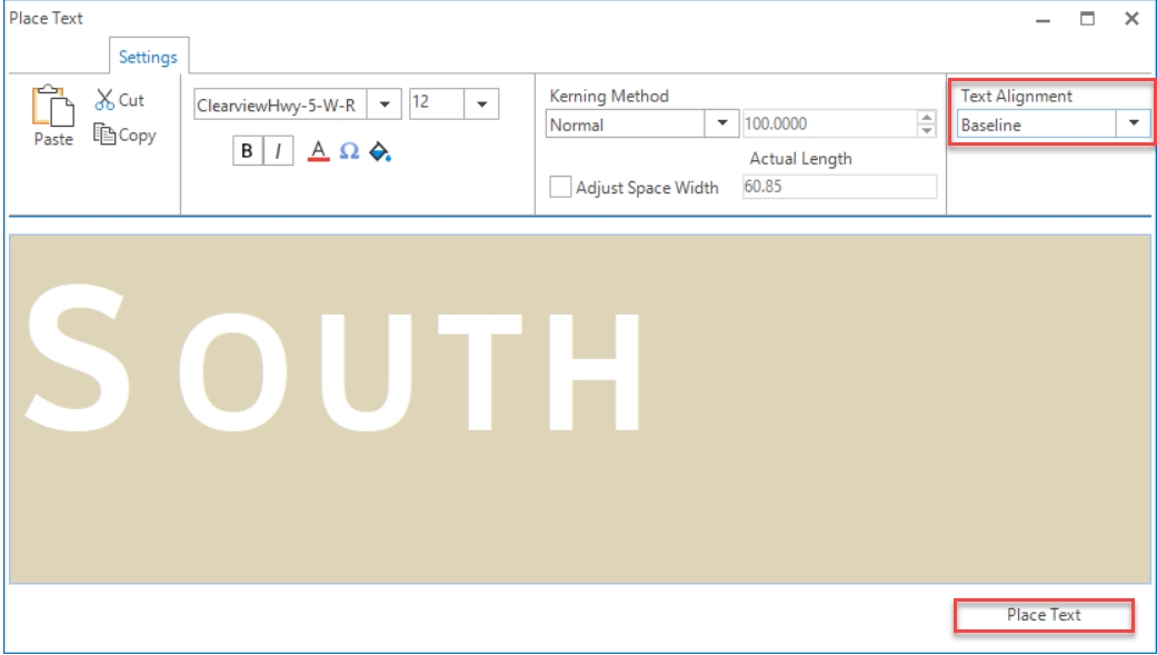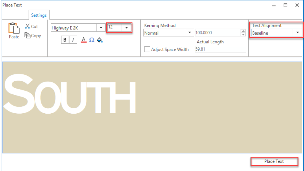 Step 2: Click in the Place Text dialog and type S. Change the Size: 12 and type OUTH. Select Text Alignment: Baseline and press the Place Text button.