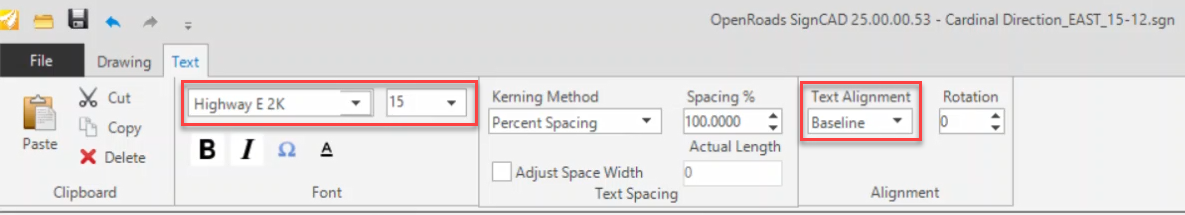 Step 2: Set the Text Alignment to Baseline. Select Font: Highway E 2K and Size: 15.