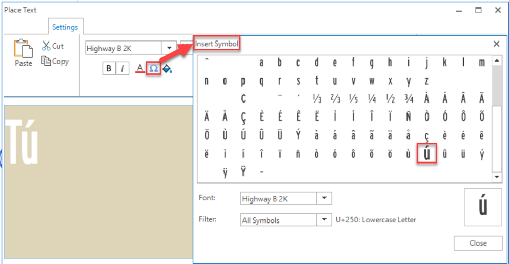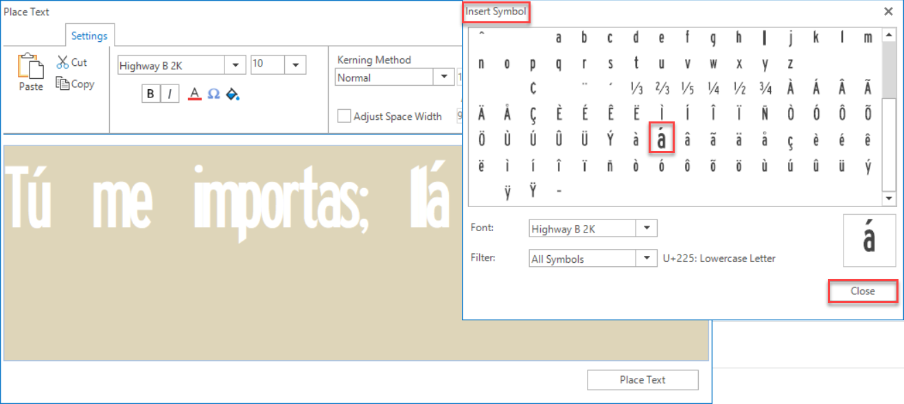 Step 2: Click in the Place Text dialog and type Tú me importas; llámame. To get the accent characters, pick the Insert Symbol icon and select the appropriate symbol to place it. Press Close to exit the Insert Symbol dialog.