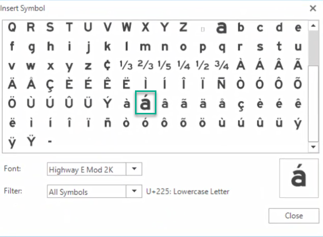 Step 7: Highlight the "a" in Chavez. From the Insert Symbol dialog, pick the á symbol to place it. Close the Insert Symbol dialog.
