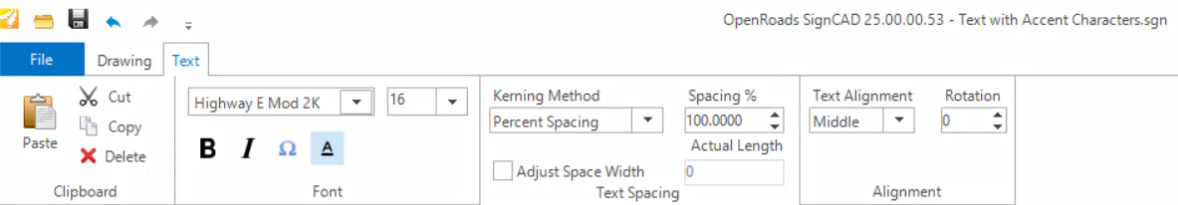 Step 1: Activate the Text tab by selecting the Drawing > Text > Place Text tool or double clicking on existing text. Select the desired Text settings (Font, Size, Color, etc).