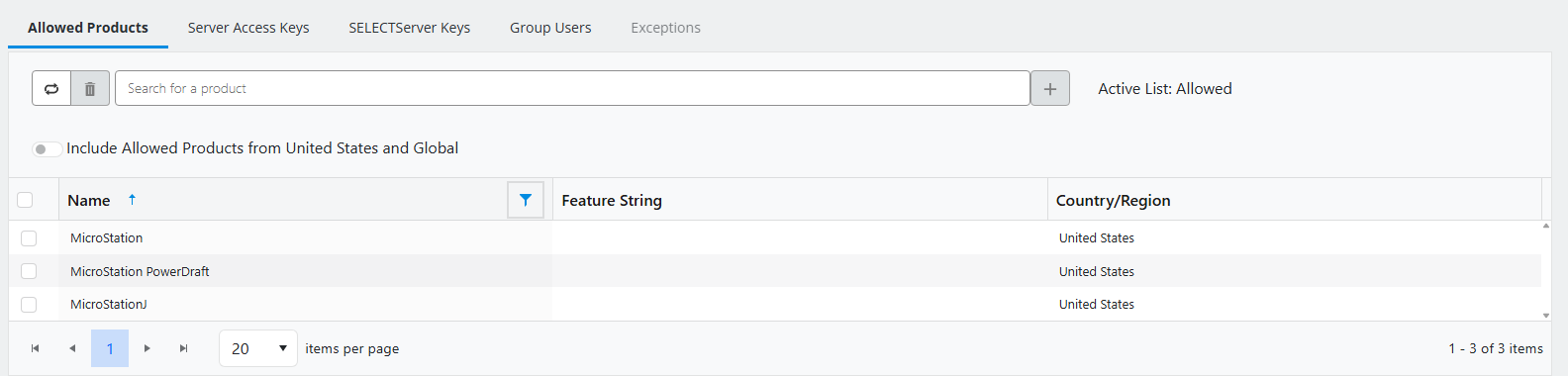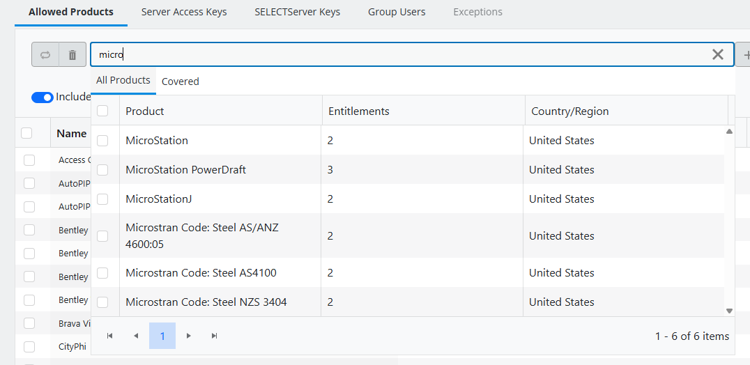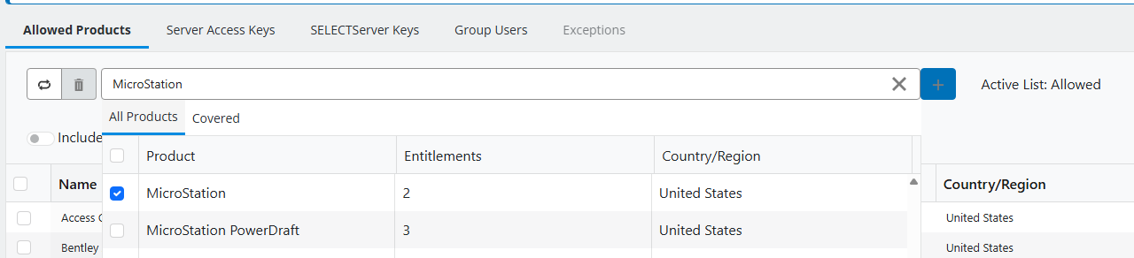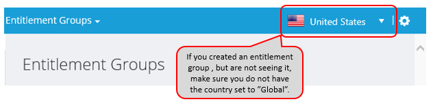 Include Allowed Products from the Entitlement country option is also shown in the Entitlement Groups list, Allowed Products Included column. Products column in the same page shows the number of products enabled for the Entitlement group. It does not add products from Entitlement Country when such are enabled.
