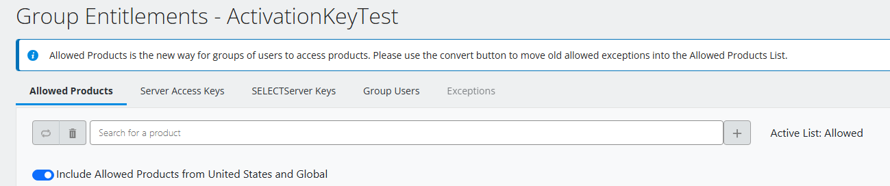 10) Once the group has at least one product in the Allowed Products list, all other products are blocked for Activation Keys and Group Users associated with this group.