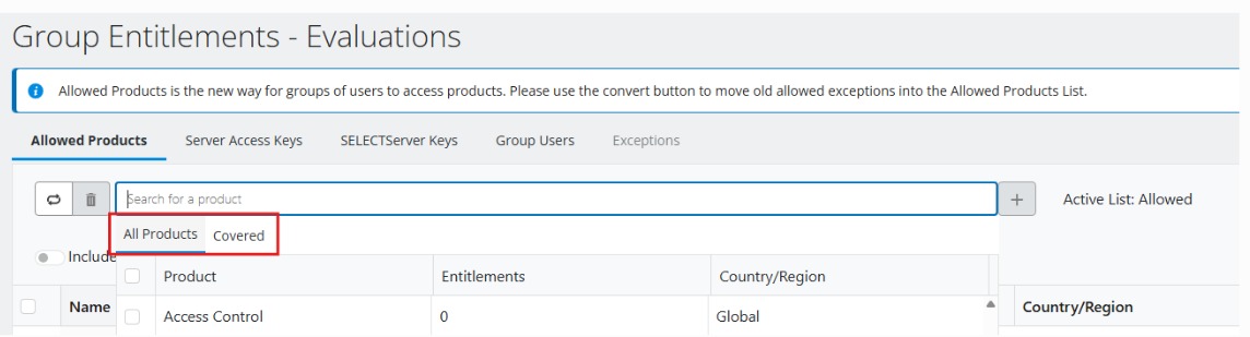 6 ) Select the Allowed Products tab, click on the Search field - there is a toggle to switch between 'All products' and 'Covered' products.