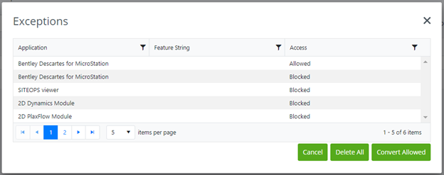 The only way to see allowed and blocked exceptions previously set for a certain entitlement group is through the conversion dialog.