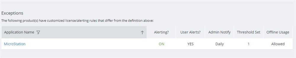 The Exceptions table lists all of the applications that have had alerting configured. You may quickly identify and change these by clicking on the hyperlinked Application Name.