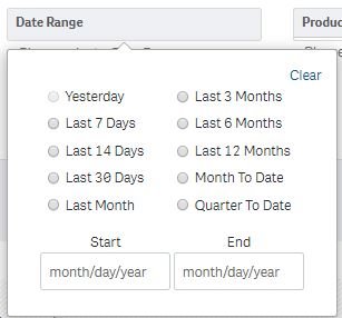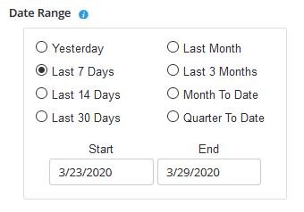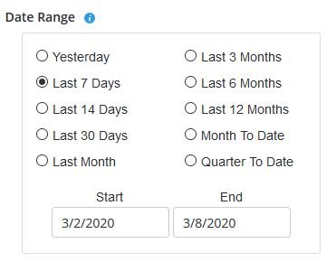 The Date Range filter has been updated on all of the reports so that you may enter a custom date range. You may enter the dates, or click in the Start and End boxes to open a calendar to pick from. The common date ranges (such as Last 3 Months) are still available.