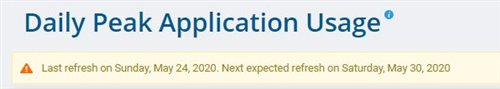 Peak application usage is determined by Application and Country. Most visuals have been modified to require a Product selection, or a Product and Country selection. It is also recommended, but not required, to select Feature String. If the required selections are not made, the visual will be replaced with a message that reads "Please select a Country, Product, and Feature String above".