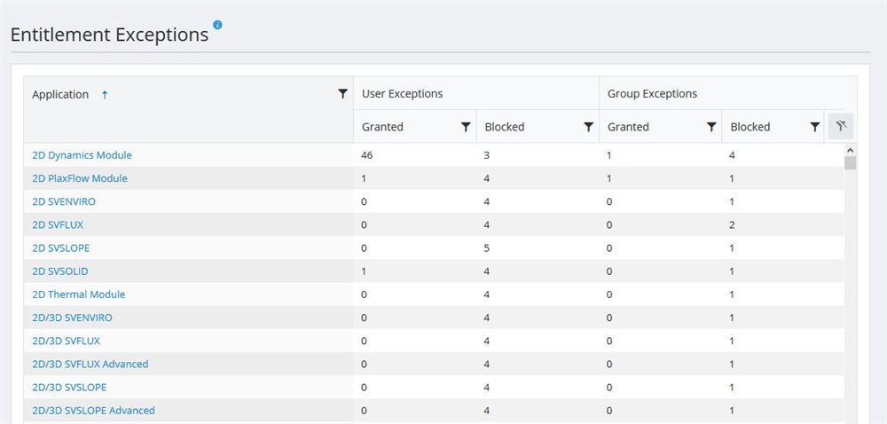 A summary of the number of User Exceptions and Group Exceptions that have been given for each Application across all Entitlement Countries. Click on any column header to sort the grid by values in that column. Click on the Application name to view a detailed list of the Exceptions for that Application.