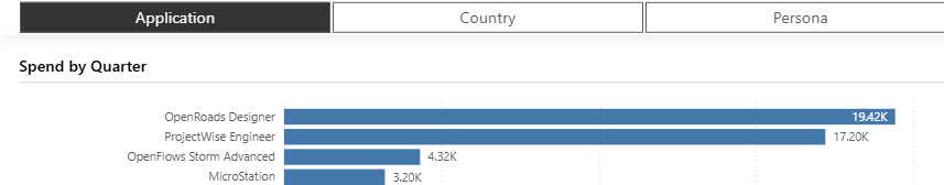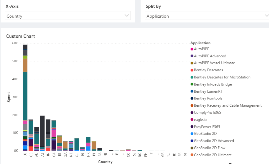 A custom stacked bar chart which displays your Spend from the selected Usage Quarter and allows you to choose the X-axis and the stack dimensions. The default selections are Country and Application. Other options include Allocation Group, Persona, and Usage Date. Some of these dimensions will have many values, so it is recommended to use the filters available in the Selections box to create a chart that helps you.
