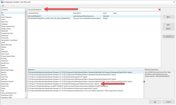 You can check this variable settings in your workspace, by first opening a dgn in your workspace the navigating to File>Settings>Configuration>Configuration Variables and searching for "MS_GUIDGNLIBLIST". In the Bentley Metric workspace this file is found in the highlighted directory below: