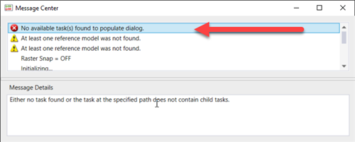 When I hit the dialog button nothing shows up and the message center reads "No available task(s) found to populate dialog.".
