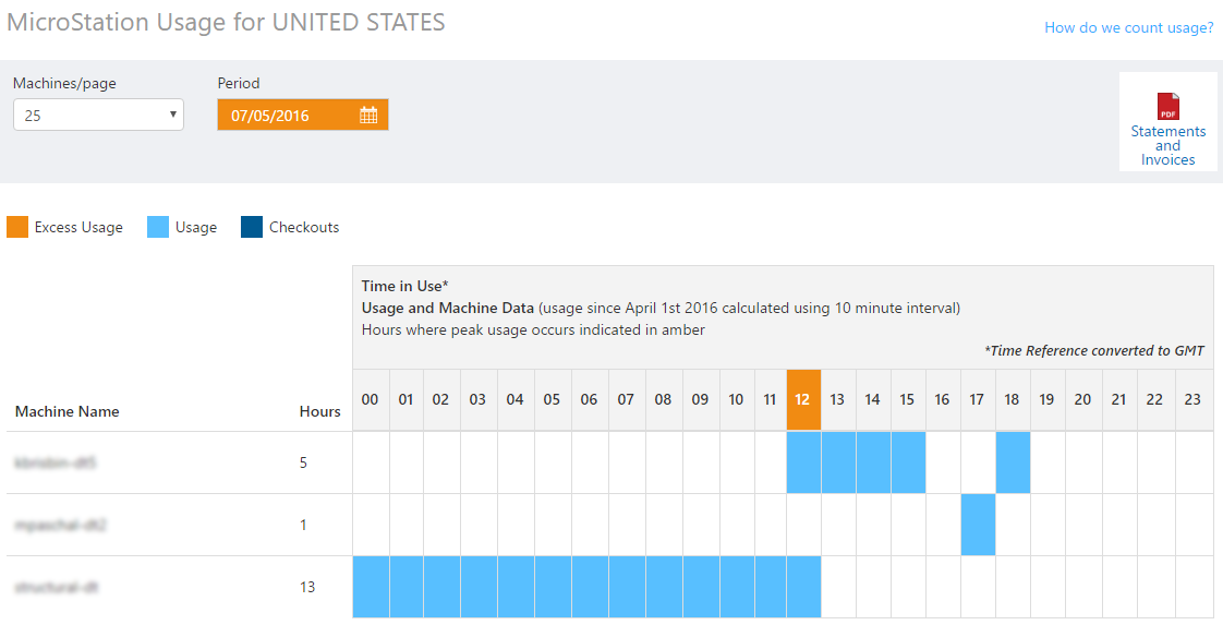 To view how usage was accrued by specific machines for a particular day, click the bar for the day.