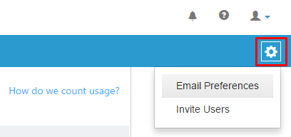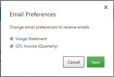 To receive monthly usage statements and any generated term licensing invoices via email, click the sprocket wheel in the upper right corner, and select Email Preferences. Then update the selections as shown below, and click the Save button.