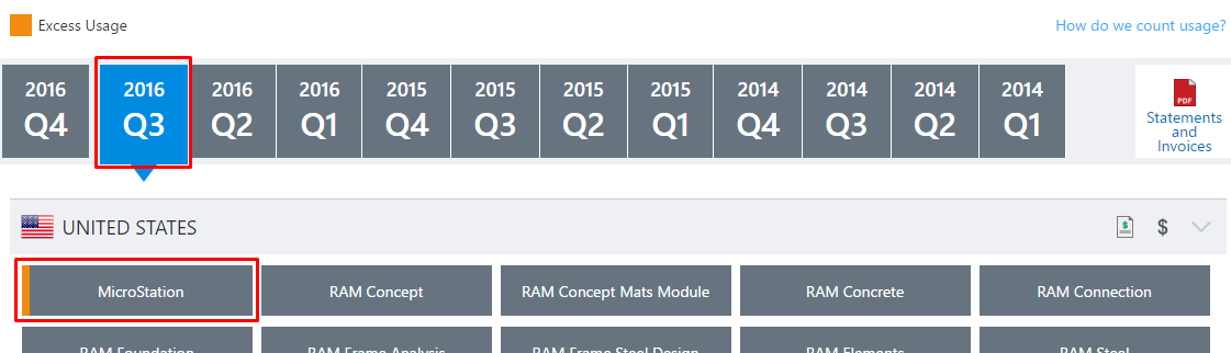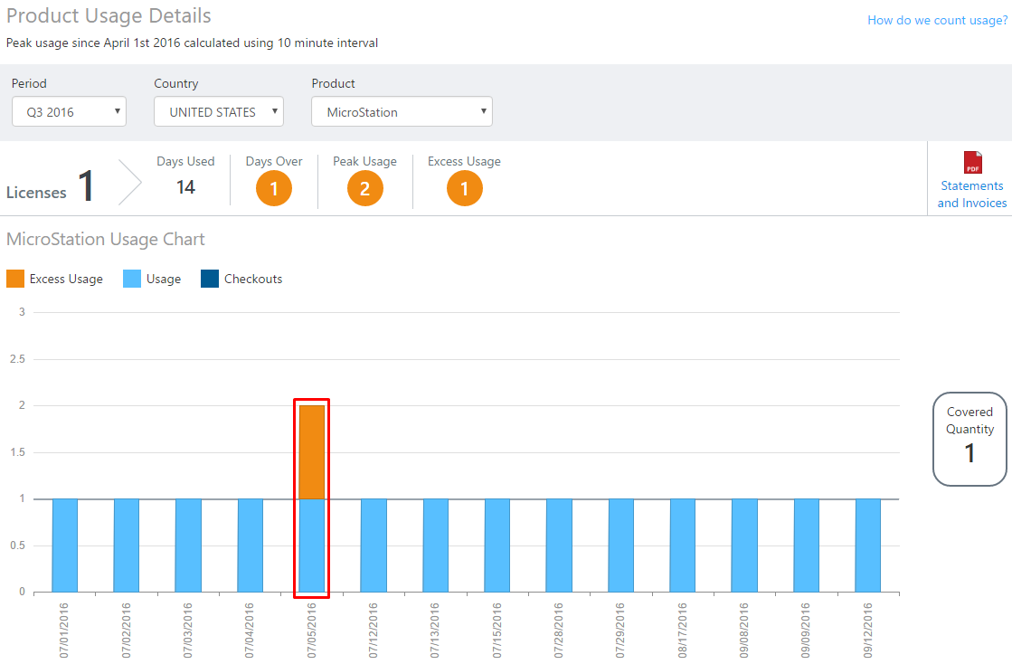 The Product Usage Report organizes usage by quarter and by country for billing purposes. Select a quarter and product of interest to display a view of all usage for the quarter. A bar chart displays the usage and highlights any excess usage in orange.